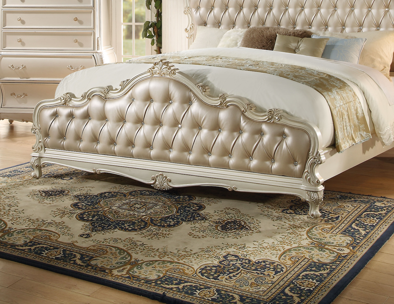 Designed exclusively for ACME, the Chantelle bedroom collection is filled with romantic wonder. The French rococo button tufted headboard and footboard complemented with a broad selection of granite top case pieces to create a perfect suite for any bedroom in the house. The versatile style of the Chantelle bedroom allows this group to be a center piece to any Decor.