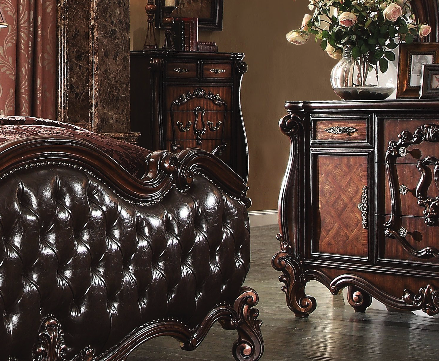 Sleep like royalty with this Versailles Bed Set. The bedroom set was inspired by old European design. The Bed features carved scrollwork accent with nailhead trim Decor and tufted upholstery on both headboard and footboard. The accent pieces crafted in wood with cherry oak veneer finish, and also include regal features such as ample storage, beveled mirror, Felt-Lined drawers, and brown copper finish hardware. The carved details and cherry oak finish give a royal look to your bedroom space with this bed.