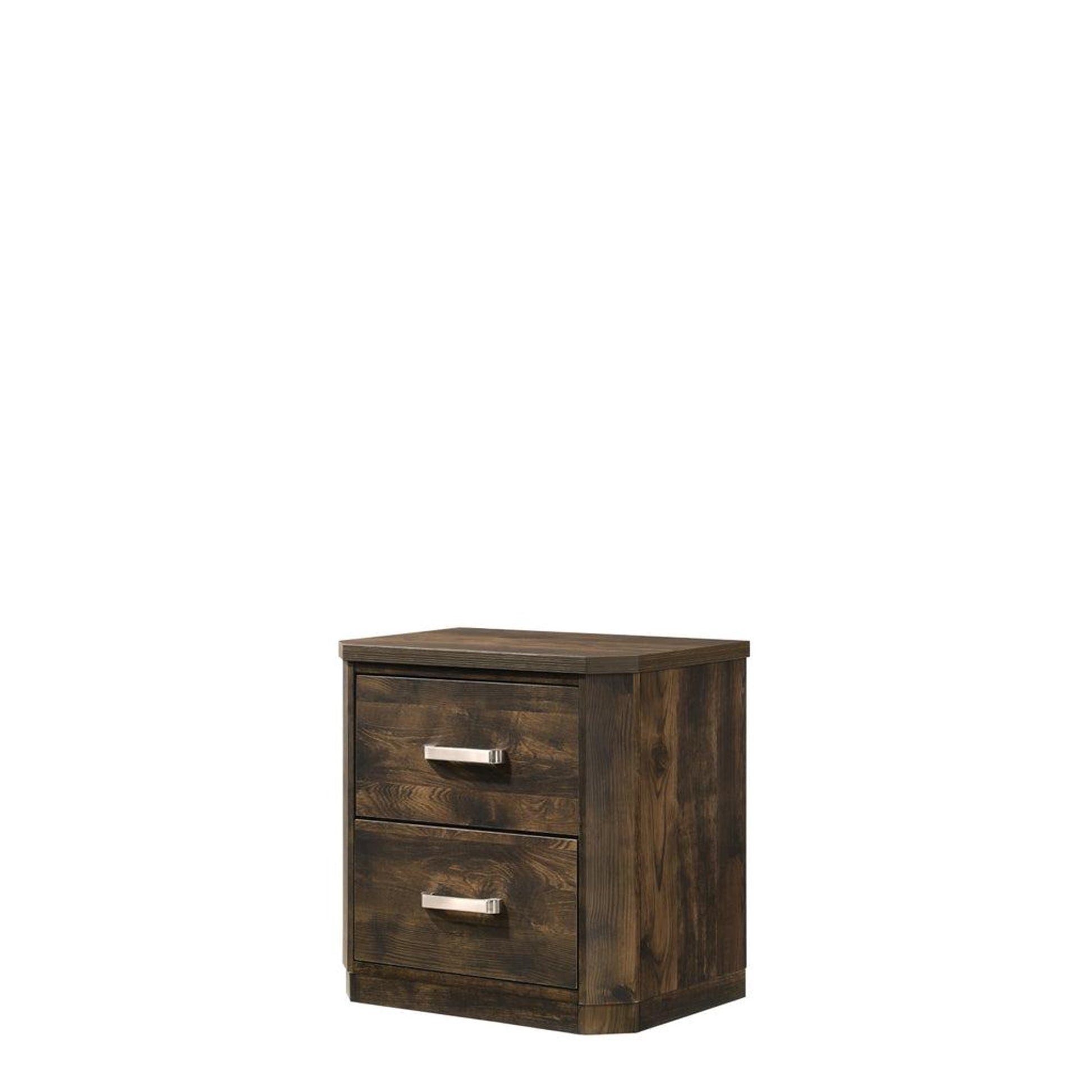 Contemporary Walnut Wood Eastern King Bed 5PCS Set by Acme Elettra 24847EK-NS-5pcs This Offer Includes: Bed + 2 Nightstands + Dresser + Mirror The Elettra bedroom collection provides a commanding presence in any bedroom. This contemporary storage bed features a rectangular headboard with low profile foot board and uniquely grooved panels, crafted with a transitional look that is an ideal addition to any bedroom. The headboard is accented with raised molding and is finished in a timeless antique walnut. The bed’s clean line design will go with various styles of case good finishes and will become the focal point for your bedroom.The collection includes a variety of bedroom pieces with plentiful storage. These calming bedroom pieces are sure to complement your style and complete your inviting bedroom ensemble. ● Finish: Rustic Walnut ● Material: Wood, Veneer (Paper), Composite Wood ● Nightstand Storage: 2 Drawers ● Dresser Storage: 6 Drawers ● 13 Slats Slats - Box Spring Required ● Safety Stop Included ● Manual Closing ● Dust-Proof Included Dimensions: ● Bed: 89"L X 85"W X 56"H 141 lbs ● Nightstand: 24"L X 16"W X 24"H 42 lbs ● Dresser: 59"L X 16"W X 36"H 128 lbs ● Mirror: 43"L X 3"W X 39"H 40 lbs